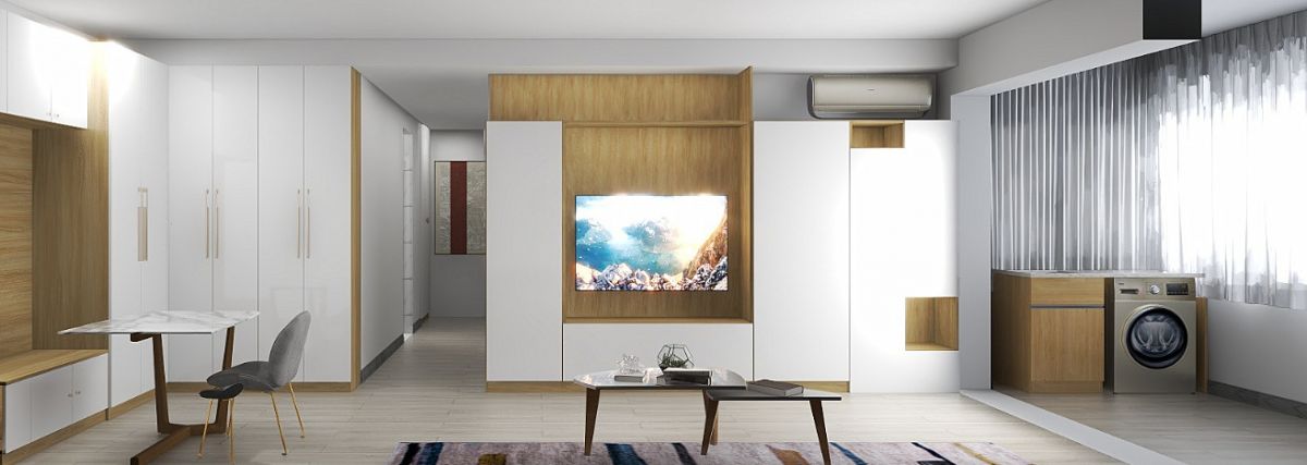 ↑ 客廳,收納櫃與電視背景牆結合,將儲物做到極致。抽屜以及不同大小的櫃子,方便各類物品的存放。嵌入式空調的設計,更整體統一 ,提升空間整潔度。
