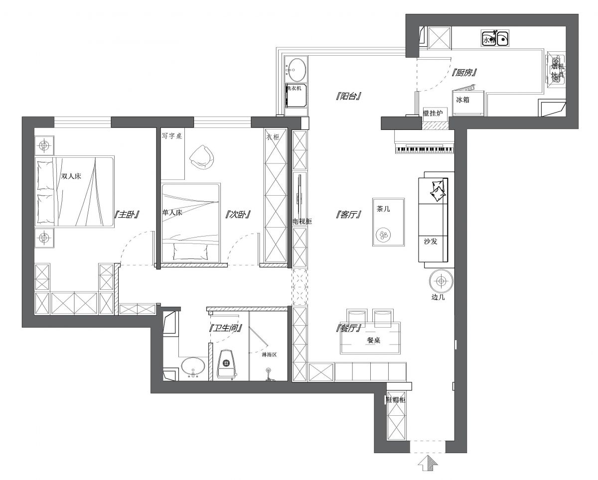 廚房門改動:原(yuan)結(jie)構(gou)中(zhong),入(ru)戶(hu)門(men)正(zheng)對(dui)廚(chu)房(fang)門(men),視(shi)覺(jiao)不(bu)美(mei)觀(guan),進(jin)入(ru)廚(chu)房(fang)的(de)動(dong)線(xian)單(dan)一(yi)且(qie)被(bei)固(gu)定(ding),客(ke)廳(ting)布(bu)局(ju)受(shou)限(xian),沙(sha)發(fa)和(he)電(dian)視(shi)的(de)位(wei)置(zhi)被(bei)迫(po)固(gu)定(ding)。而(er)且(qie)廚(chu)房(fang)采(cai)光(guang)受(shou)限(xian),客(ke)廳(ting)陽(yang)台(tai)管(guan)線(xian)交(jiao)錯(cuo),利(li)用(yong)率(lv)低(di),變(bian)成(cheng)了(le)雜(za)物(wu)陽(yang)台(tai),也(ye)影(ying)響(xiang)了(le)廚(chu)房(fang)窗(chuang)戶(hu)的(de)使(shi)用(yong)。通(tong)過(guo)改(gai)變(bian)廚(chu)房(fang)門(men)的(de)開(kai)啟(qi)位(wei)置(zhi),增(zeng)加(jia)了(le)廚(chu)房(fang)空(kong)間(jian)的(de)功(gong)能(neng)性(xing)和(he)利(li)用(yong)率(lv),動(dong)線(xian)的(de)調(tiao)整(zheng),使(shi)沙(sha)發(fa)和(he)電(dian)視(shi)的(de)擺(bai)放(fang)更(geng)加(jia)合(he)理(li),並(bing)極(ji)大(da)地(di)豐(feng)富(fu)了(le)客(ke)餐(can)廳(ting)的(de)收(shou)納(na)功(gong)能(neng),客(ke)廳(ting)陽(yang)台(tai)也(ye)得(de)到(dao)了(le)更(geng)好(hao)的(de)利(li)用(yong)。